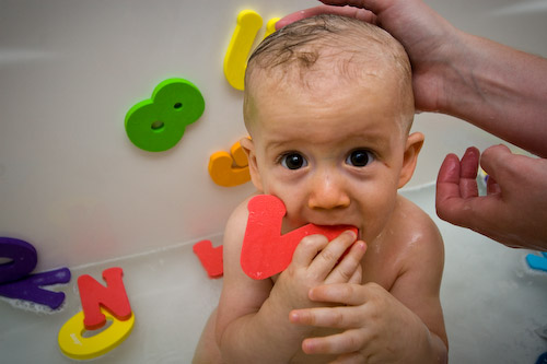 This was from the first time, complete with spongy alphanumeric characters he used to encode some messages on the tub wall. He liked Z. Alot.
