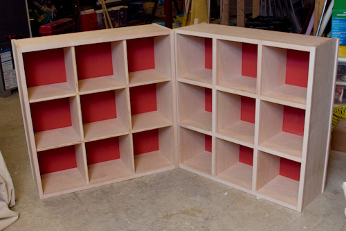 The center column is going to be open cubbys, while the bottom corners are going to each hold two drawers. The remaining will have doors.