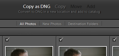 Above this preview grid of the photos to import, you’ll find a some options: Copy as DNG, Copy, Move, and Add.