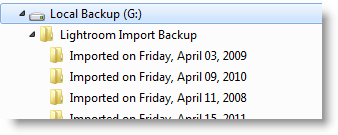 Make a Second Copy To is the setting I mentioned above to copy the original files from the memory card to my G:Lightroom Import Backup directory.  From that screenshot you’ll see it puts every import into its own sub-folder named after the date of the import.