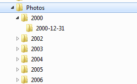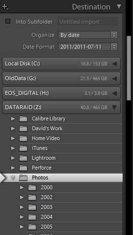As you can see in the screenshot, I have Lightroom setup to save images into sub-folders of z:Photos by year and capture date.  This results in a directory structure that is easily browsable by date: