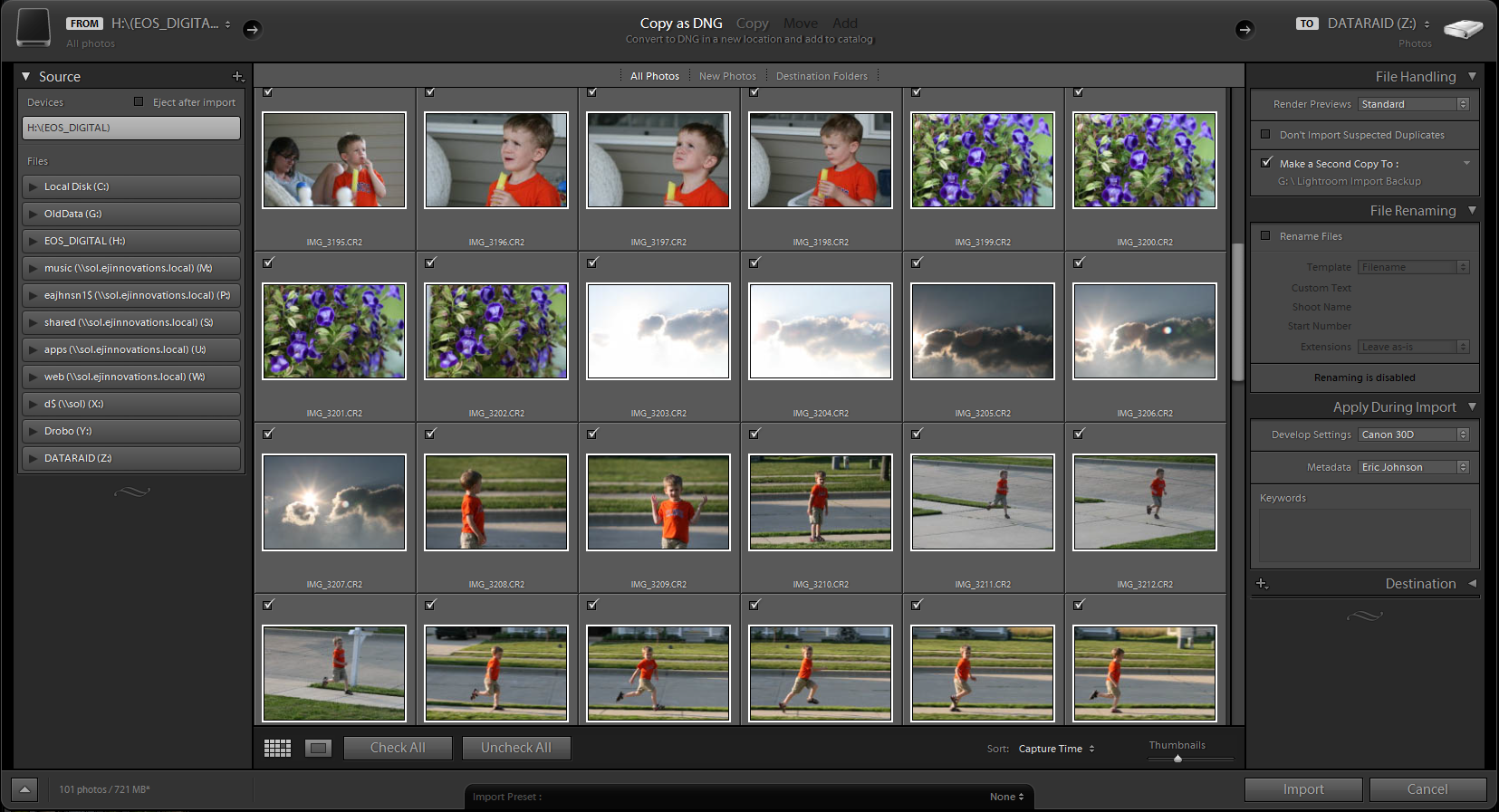 You can check and un-check each of the photos – only those checked will be imported into Lightroom.  Since I wipe my memory cards before I start using them, I rarely un-check anything here.  I’ll take care of deleting bad ones once they’re in Lightroom and I can get a much better look at them.