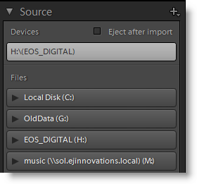 Lightroom will display all attached drives and devices so the list on the left can get fairly long.  Here’s what mine looks like: