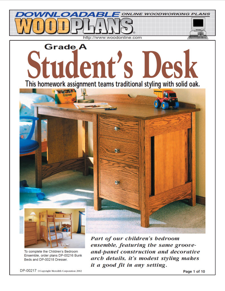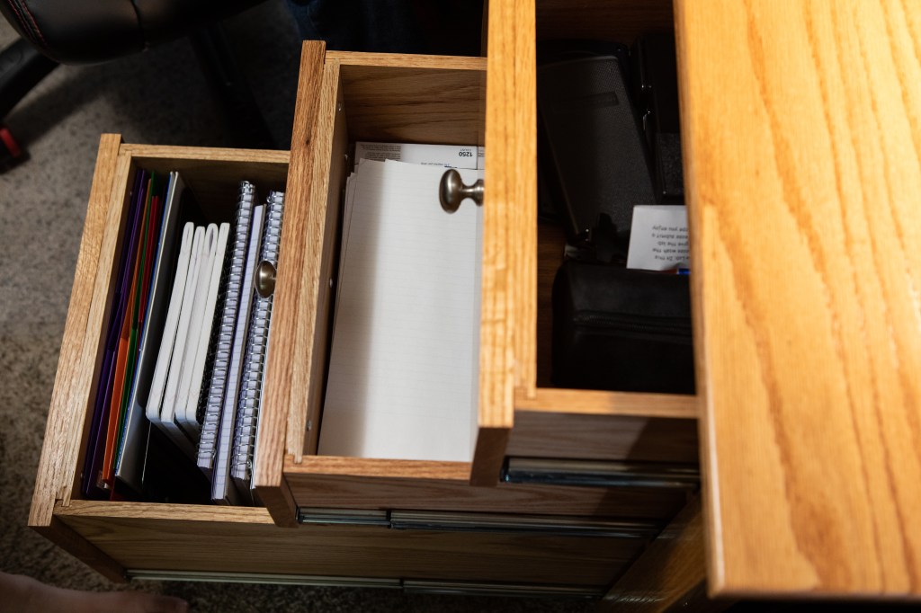 Start to finish, it took one day short of a month. I finished it exactly 12:01 in the morning just a couple days before it was going to be needed for school. I made a couple small changes from the plans: got rid of the “crest” on the top, in favor of more working space; put the drawers on the other side since Claire is left-handed.