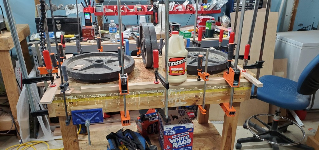 Following Rob Cosman’s plans, I decided to make my new top using 4 layers of 3/4″ thick MDF. I’ve never used so much glue in my life.