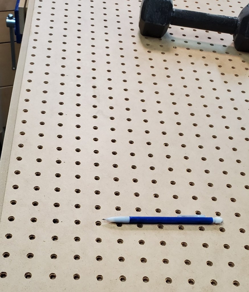 I used a 3/4″ spade/paddle bit and a Portable Drill Guide to make the holes all the way through the bench top. Using a sheet of pegboard, I got the spacing how I wanted, and went to town.