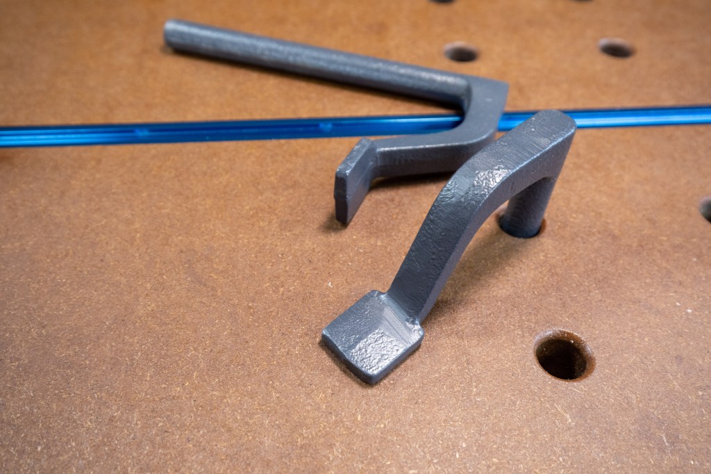 For those unfamiliar, dog holes are used to hold various accessories – usually for clamping things down. Small pegs, called bench dogs, often go in them to grip wood between them and a mating dog on the vise (see the blue piece above).