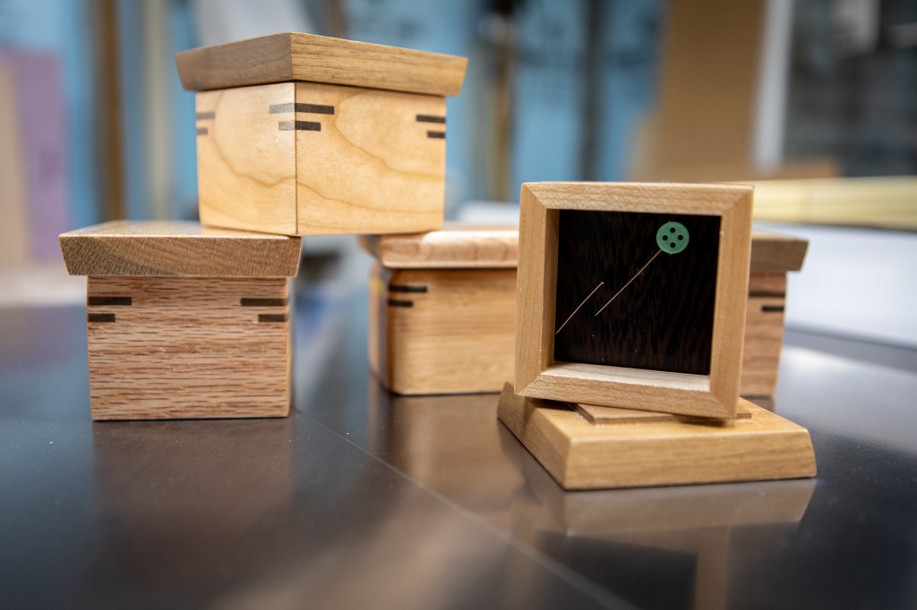 Here’s some of the first set, made with a mix of oak, cherry, and walnut. In one I embedded a pair of small magnets so Ana can use it to hold pins and needles at her sewing table.