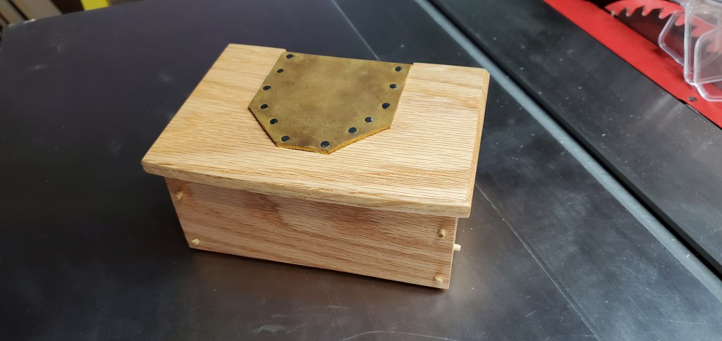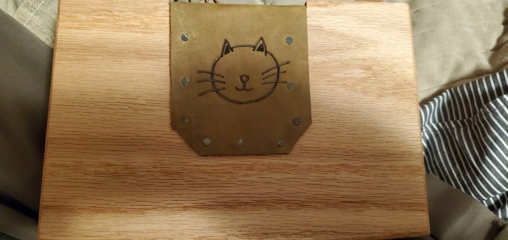 Another style of box I’ve made from the Basic Box Making book by Doug Stowe features a leather hinge. This was the second kind of box I made from the book and was the first time working with another material. They’re pretty handy, we’ve got several of them put to use in the house – holding things ranging from cat medicine to COVID masks.