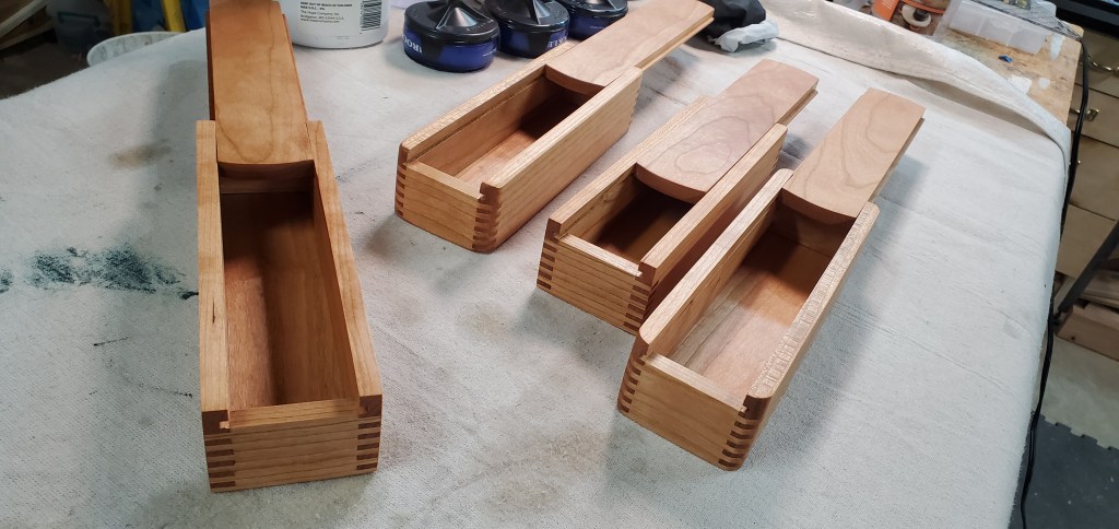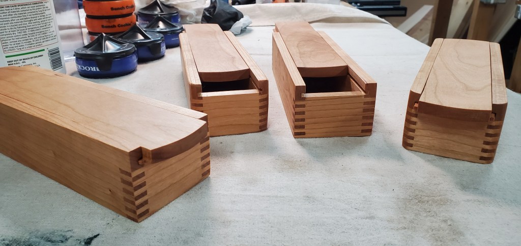 Another box from the Basic Box Making book which I’ve built in the past 6 months is the pencil box. My sister is using one for crochet needles, another is just sitting on my desk, and I honestly couldn’t tell you what the others are holding. These were the first box joints I’ve done.