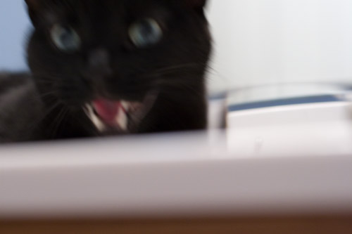 All of a sudden, World War III breaks out in the adjacent room – I hear cats attacking each other, and I don’t mean play-fighting. I mean all-out, screaming at the top of their lungs, I’m going to kill you attacking. I jump up to find Ana’s cat Neo mid-air and tackling my cat Dozer in the open window. I then hear a third cat, out on the porch – I’ll refer to him as Mr. Instigator. I have to throw our cats apart, then sit between them growling/hissing/screaming at each other in the hallway. Ana wakes up and runs downstairs, at which point I tell her to grab Dozer and get him out of there. Neo keeps trying to get past me to attack him, but I was able to keep him at bay.