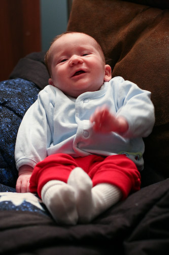 He has been starting to smile a lot more recently, although trying to catch it with a camera (still or video) seems to be about as elusive as the Loch Ness Monster. Anway, here’s a quick little clip followed by some hiccup action.
