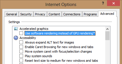Skimming through the IE settings, I found an option for using software rendering instead of GPU rendering.